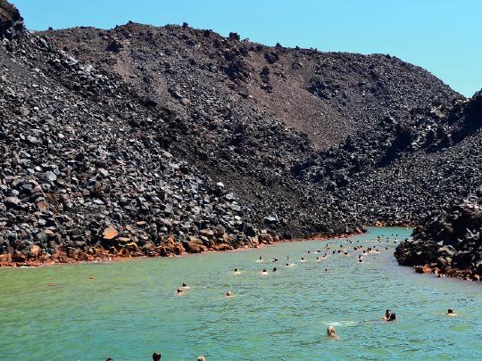 Nea Kameni ist von warmem, dunklem Wasser umgeben, das für seine therapeutische Wirkung bekannt ist. Besucher können die Insel mit Ausflugsbooten erreichen, die vom alten Hafen von Fira oder vom Hafen von Athinios abfahren, und ein Bad in den heißen Quellen genießen. Das Heilwasser von Nea Kameni besteht aus Schwefel, Eisen und Mangan, die gegen viele Krankheiten wirken, an denen ältere Menschen normalerweise leiden. Das warme Wasser wirkt Wunder bei Erkrankungen des Bewegungsapparats (Arthritis, Muskelsteifheit usw.) und der Haut (Dermatitis, Ekzeme usw.).